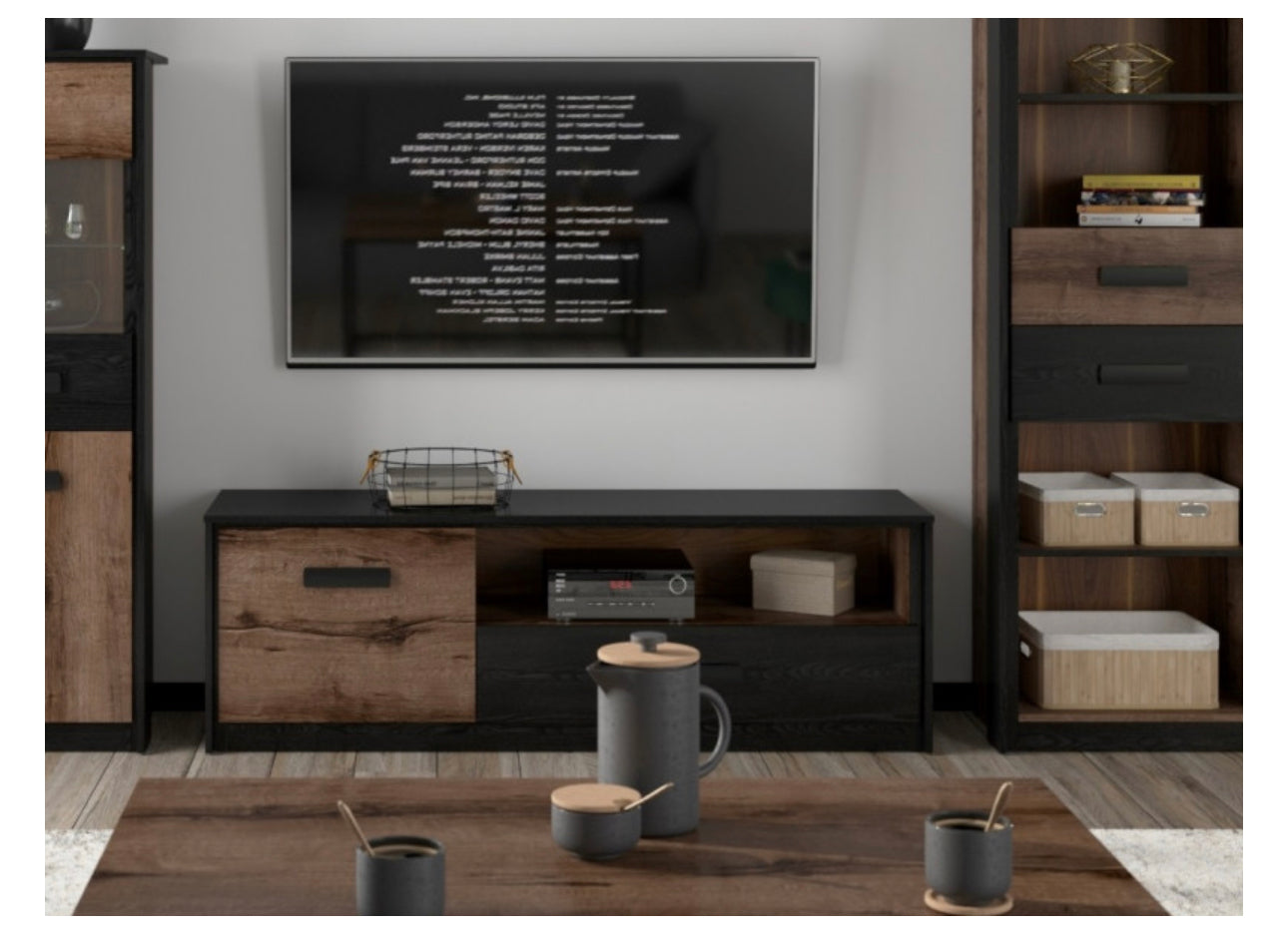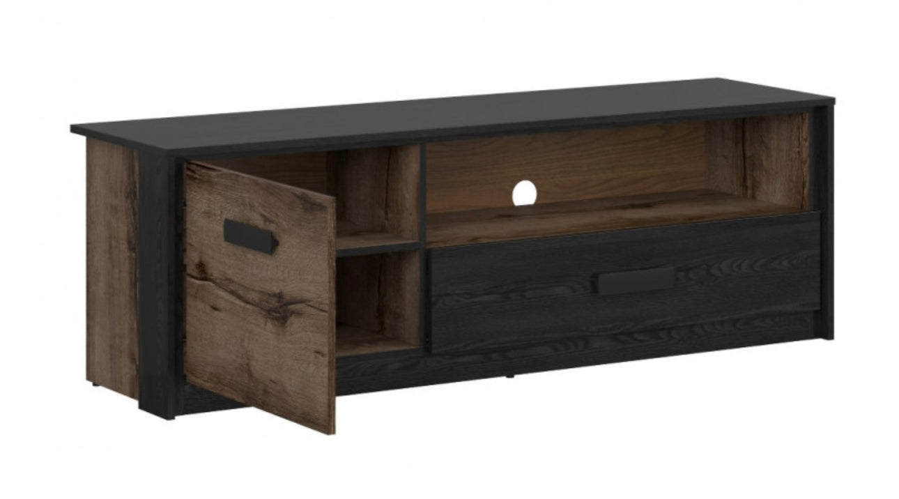 TV Cabinet Entertainment Unit with Door, Drawer and shelf providing extra storage space in any room of your house. The unit matches the rest of range and comes in a rich dark oak and black oak effect finish. Quality, modern and expensive looking furniture.