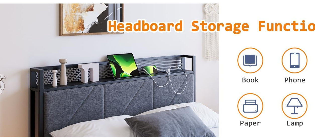 【Headboard with Storage and Charging Station】The headboard is equipped with a grid wooden board storage rack, which can easily hold small items such as mobile phones, glasses and books. The headboard is equipped with 2 USB ports and 2 power strips. This charging station can conveniently charge your tablet, mobile phone or other mobile devices.