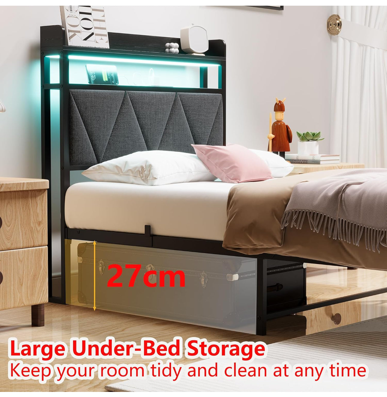 Single Bed Frames with 3ft Upholstered Wooden Two shelf Storage Headboard, Charging Station,LED Lights