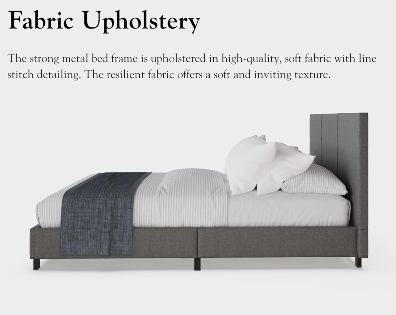 - ✔️ DURABLE AND STURDY: This bed frame is upholstered in high quality, durable San Deigo fabric. The is hard wearing and resilient fabric offers a soft and inviting texture that you'll love sinking into after a long day. The full metal frame with padded upholstery provides a sturdy and reliable foundation for your mattress. The metal frame is also resistant to rust and corrosion, and it does not squeak or creak when you move on the bed.
