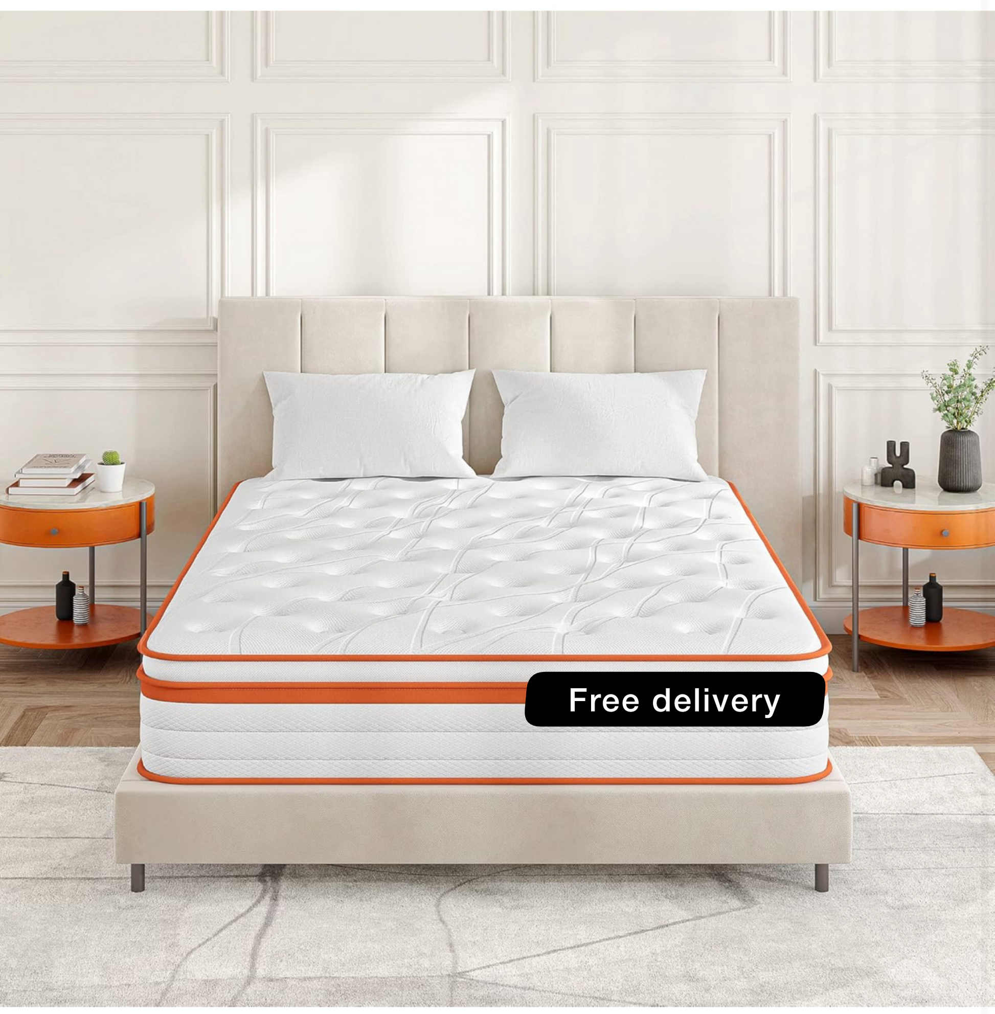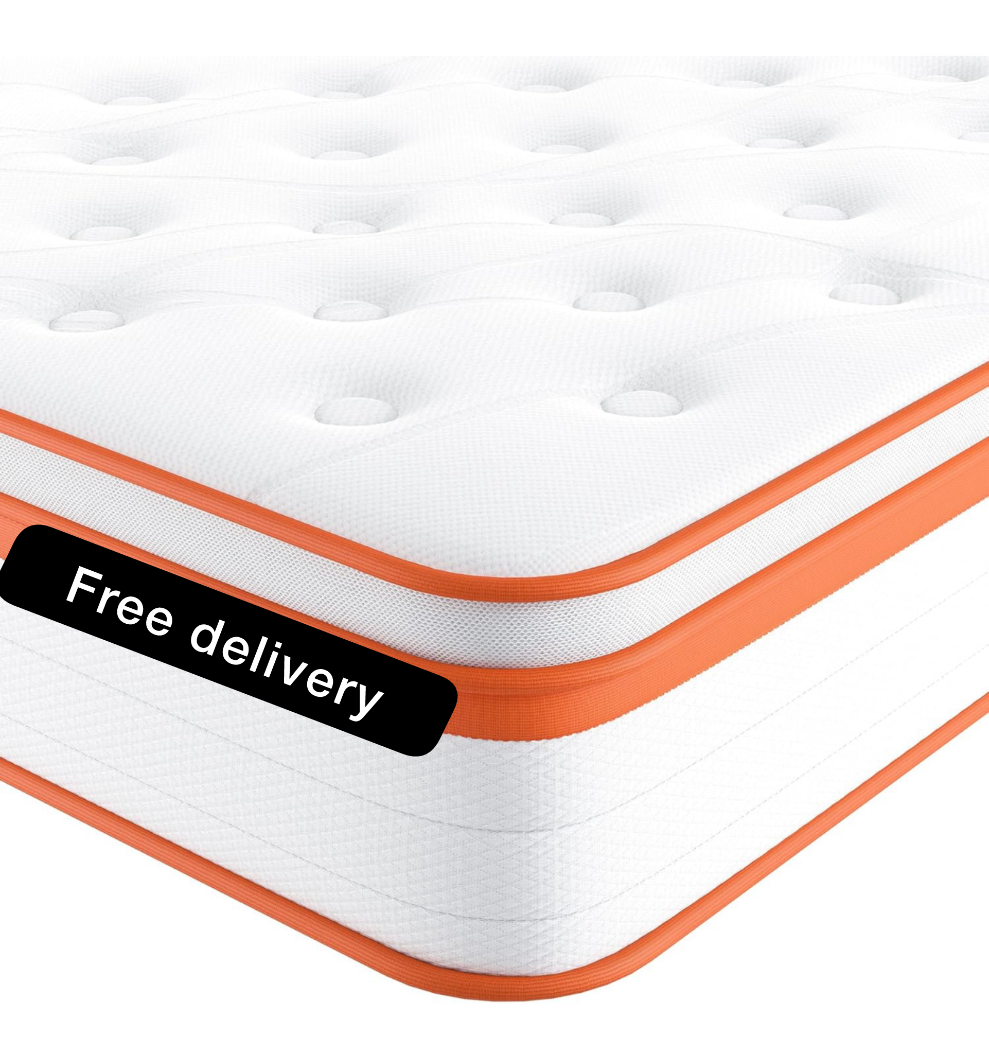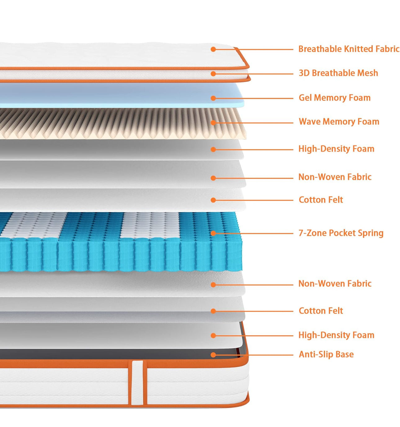 🛌7-Zone Orthopaedic:The 7-zone pocket spring mattress divides the individually wrapped pocket springs into 7 zones, providing professional support for 7 parts of the head, neck, shoulders, back, waist, buttocks, legs and feet. Therefore, the 4ft hybrid mattress can help you adjust your sleeping position in real time to keep your spine aligned, effectively relieving muscle tension and reducing back pain. Suitable for different sleeping positions.