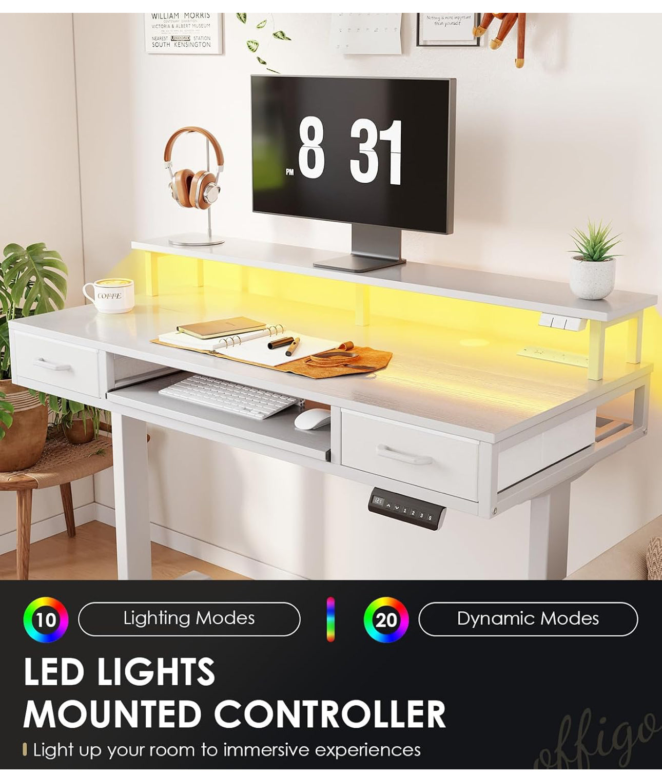 Standing Desk, Height Adjustable Desk with Keyboard Tray, 120cm Adjustable Desk with Monitor Stand, Computer Desk with Drawers, Gaming Desk Height Adjustable with Sockets and Light Bar, White.