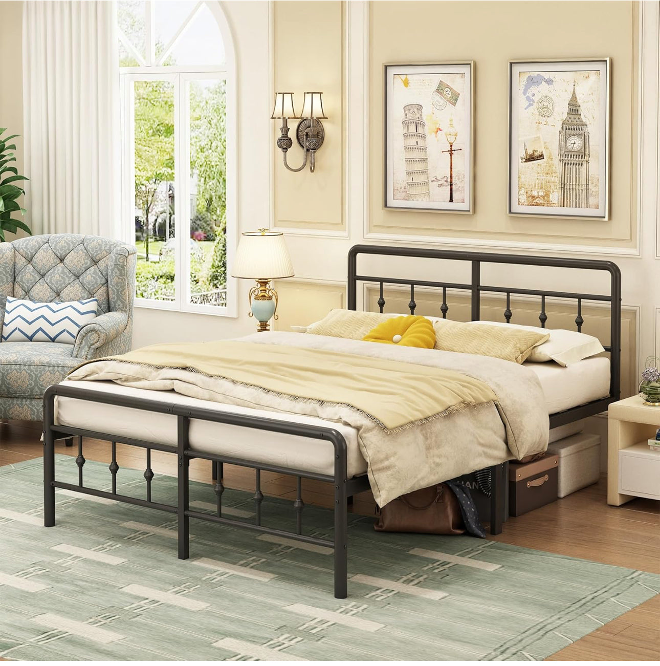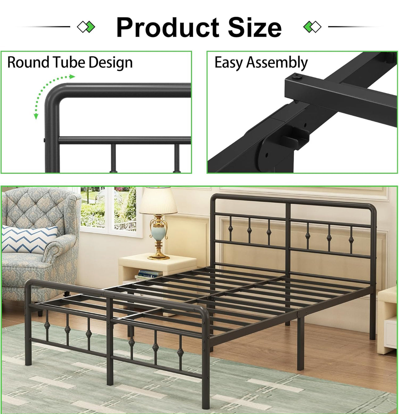 Super King Bed Frame with Victorian Headboard and Footboard, 36cm High Super King Size Bed Frame with Steel Slats Support, No Box Spring Needed, Easy Assembly, Noise Free, Black.