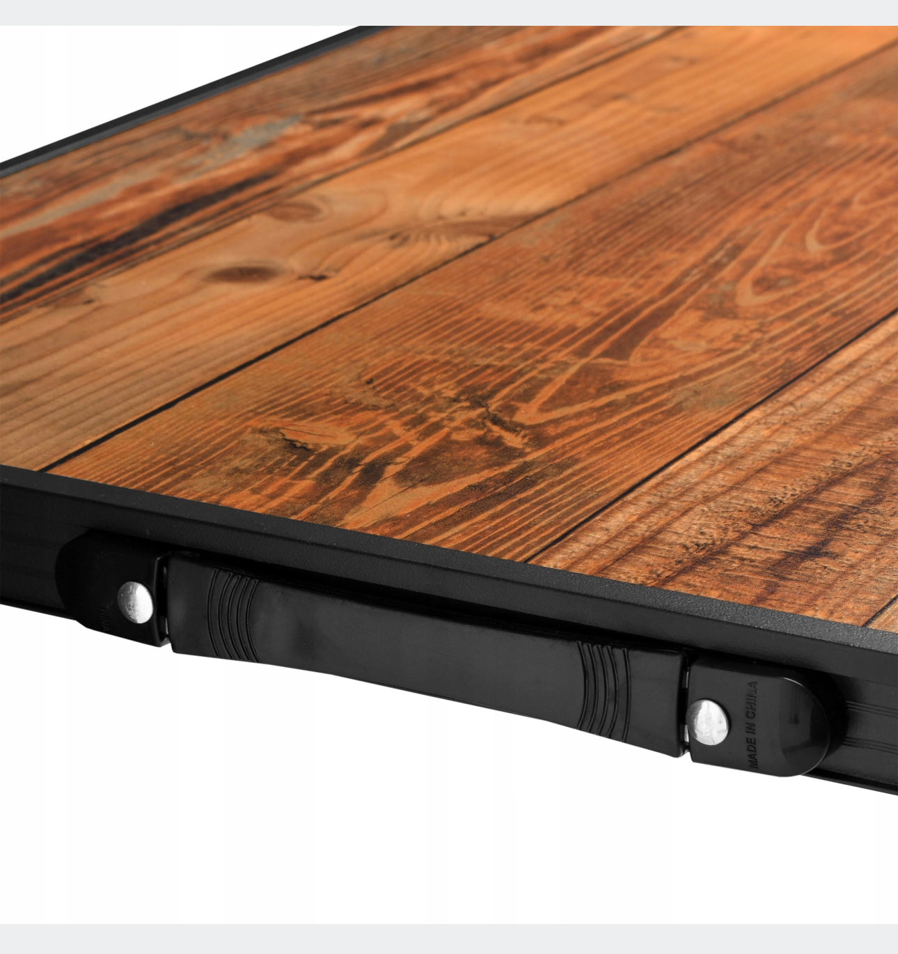 The Trip table is a practical tourist table made of high-quality materials. A well-thought-out combination of the aluminum structure of the frame with the MDF tabletop ensures the table's solidity and stability. The undoubted advantage of the model is its low weight. All thanks to the aluminum used in the production process. Low weight guarantees trouble-free transport. The table is easy to unfold, and after folding it takes a convenient form of a suitcase. The built-in handle makes it easy to carry. The table has a three-level height adjustment, thanks to which we can adjust it to our needs. In the LOFT version, the Trip table is equipped with a top with an interesting pattern imitating wood. 4 comfortable chairs included! Specification:
