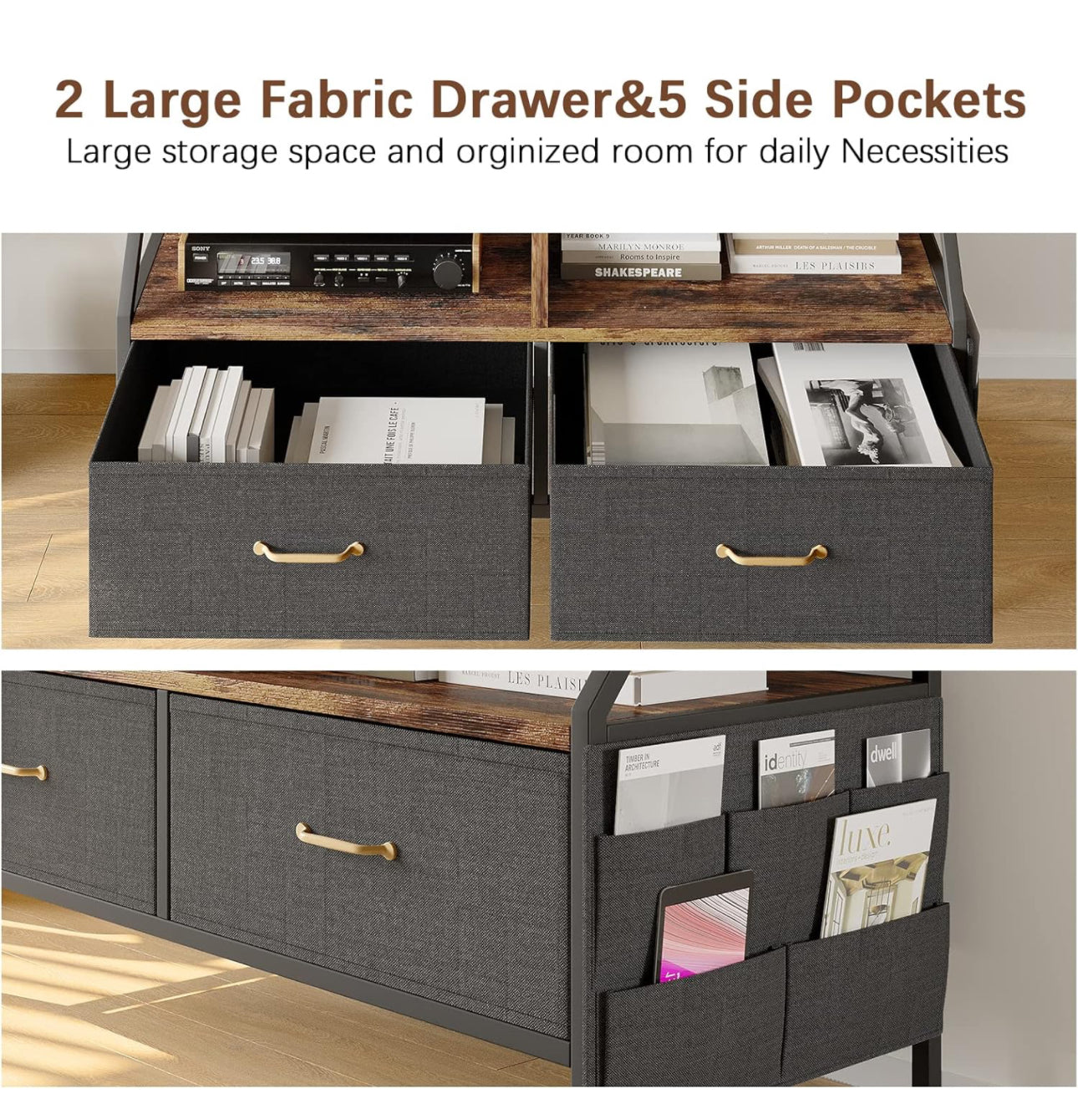 Large Storage Space:TV Cabinet with 2 Large Fabric Boxes supply you much room to storage books, working files, DVD players, art displays etc Black Boxes with Luxury golden handles perfect match the high quality rustic console table; 5 devided side pockets for the game console, remote controls makes your daily stuffs in a organized way and tidy.