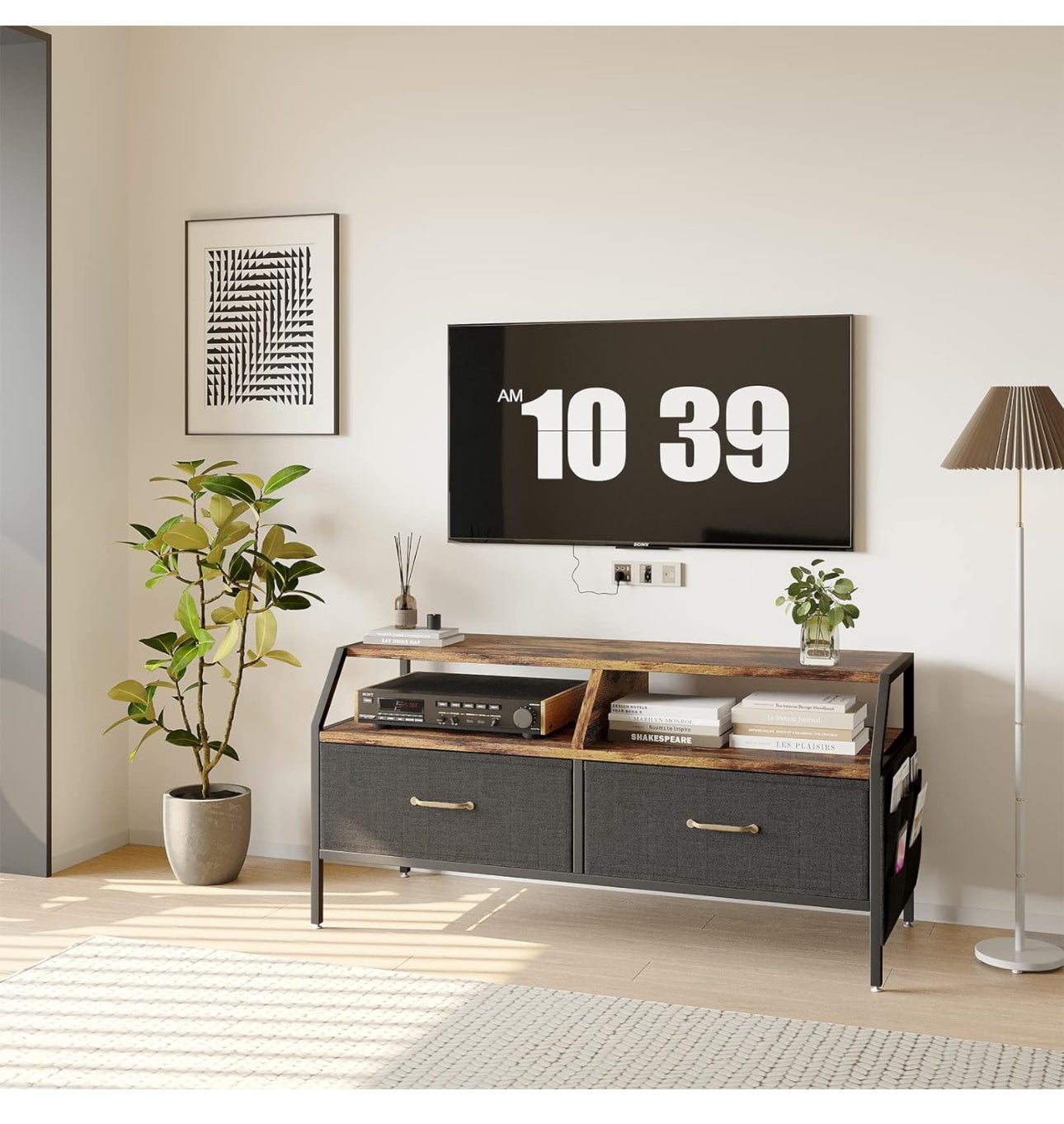 TV Cabinet, TV Stand with 2 Large Fabric Storage Boxes and 5 Divided Side Pockets,Rustic Console Table with Unique Bevel Angle Adjustable Leg Pads for Living ROOM Bedroom Office. Unique Design :TV Stand with special Bevel Angle design enhance the elegance appereance and improve your personal taste. Oblique openings also make it easier to put things into the storage shelf, hence will be more convinient and save your much time.