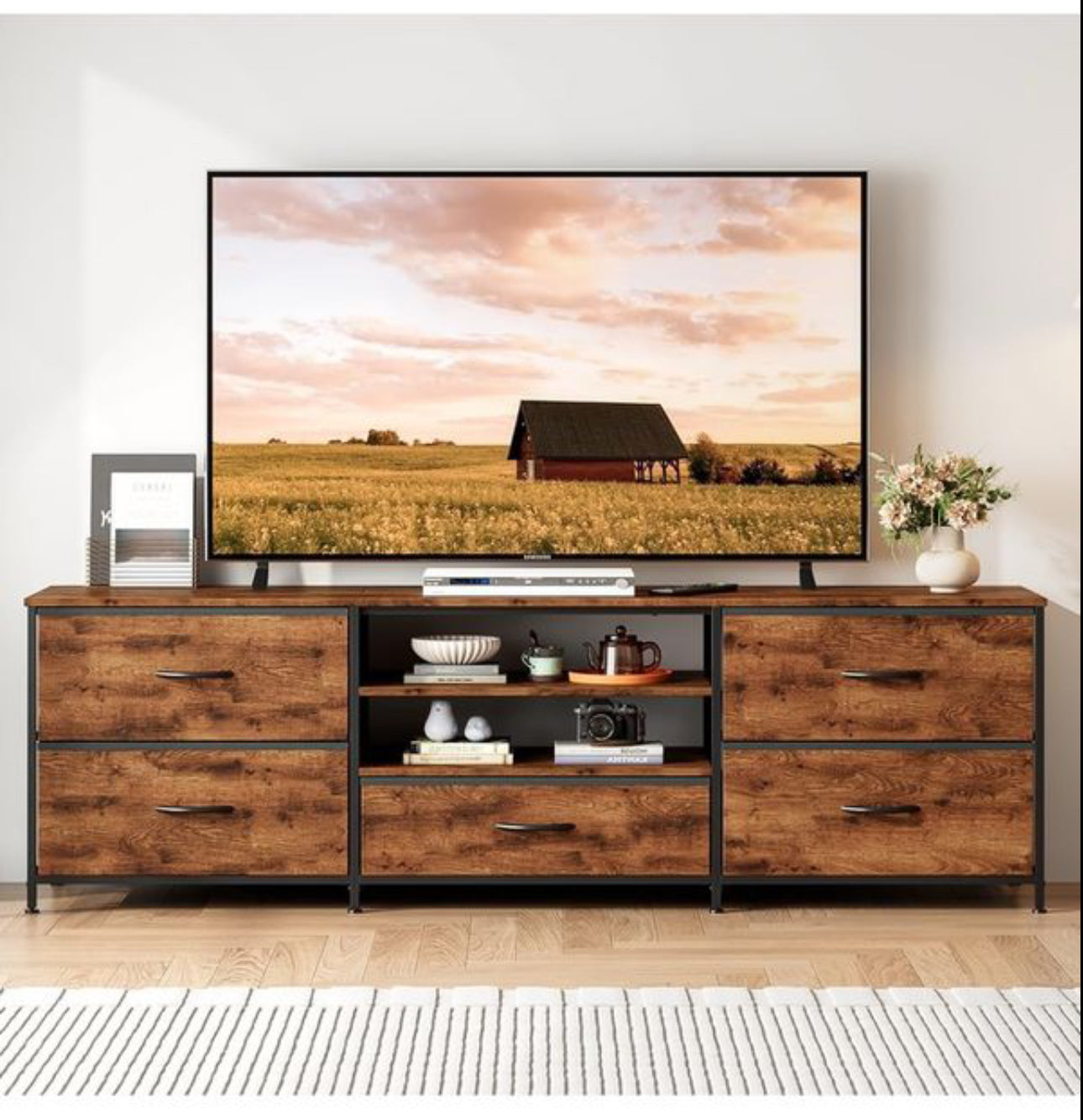 Roomy Storage Space: This TV stand with storage features 5 foldable deep fabric drawers, which provide endless organizational possibilities and protect your privacy as well. The 3 open shelves with wood top are waterproof, easy to clean and offer sufficient storage for your TV accessories, such as CDs, DVDs, game controller, etc.