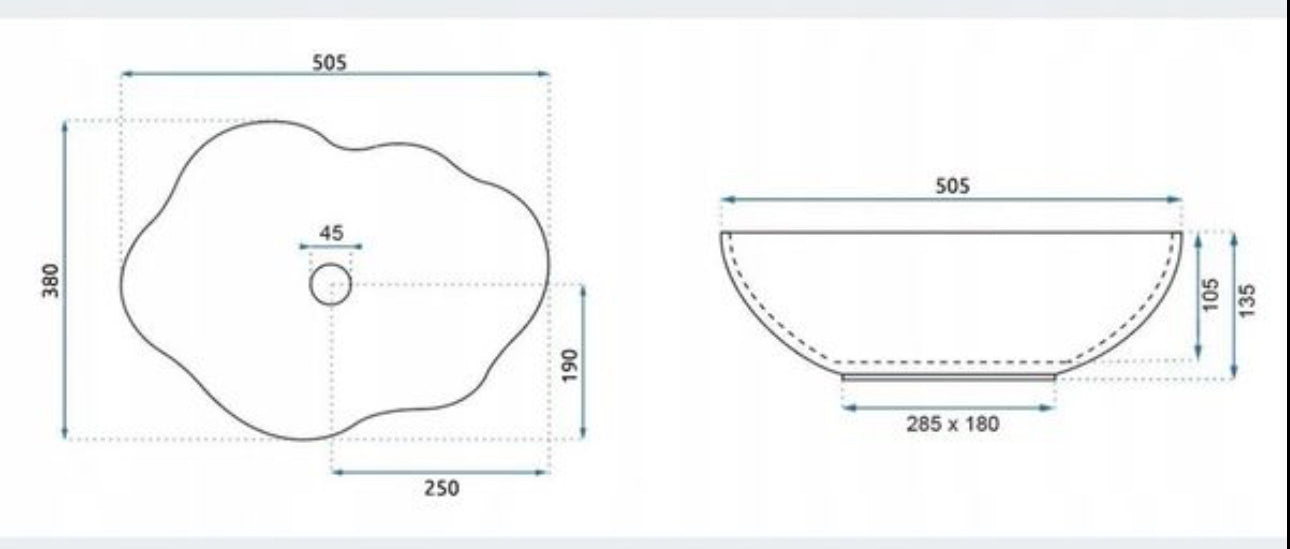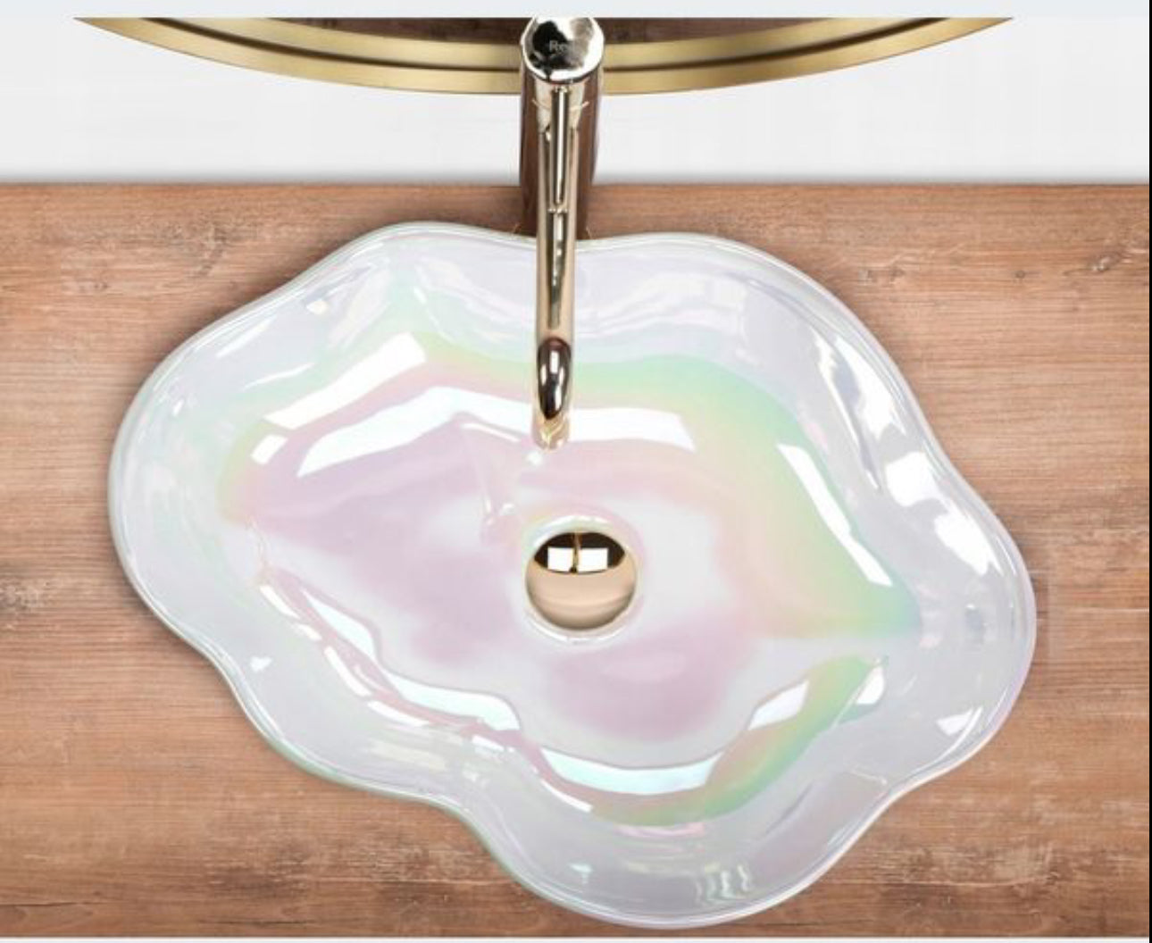 We present a unique countertop washbasin a, which is the quintessence of elegance and modernity. This asymmetrical ceramic sink features a unique, irritating pearl-like finish that reflects light beautifully, creating an effect of depth and brilliance.